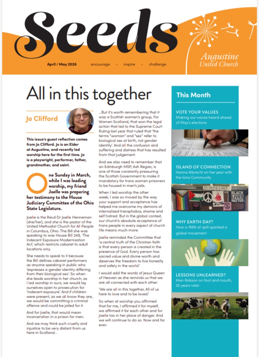 AUC is a Trans-affirming and celebrating community. We believe all genders are made in the image of God and that our many members who are Transgender are a gift from God to be celebrated. As one body we share hurt and joy, and in our current climate reaffirm that all our congregational events and groups welcome people of all genders (including trans, non-binary, intersex and all others) and seek to enact Resolution 21 of the URC General Assembly 2023: The General Assembly of the URC, affirms the human dignity of transgender, nonbinary and gender non-conforming people and asserts their right, within and beyond the URC, to live without threat of violence and hatred.